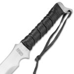 The handle has a lanyard hole with lanyard and is wrapped with genuine black leather in the traditional Samurai sword style