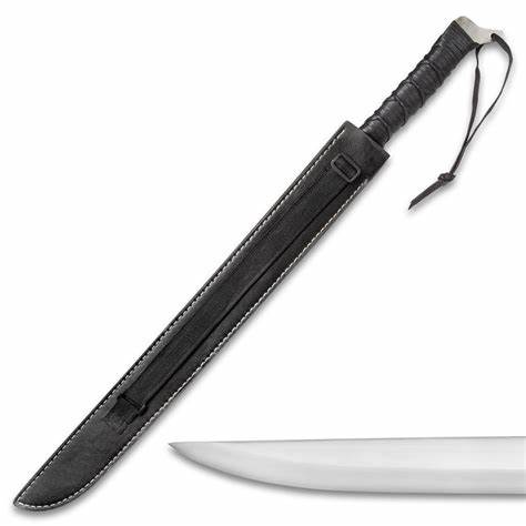 The short sword is 27” in overall length and is housed in a genuine premium leather shoulder sheath for ease of carry