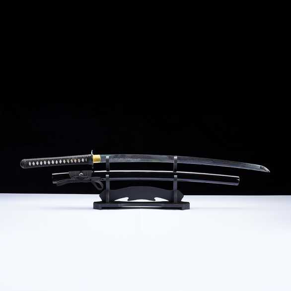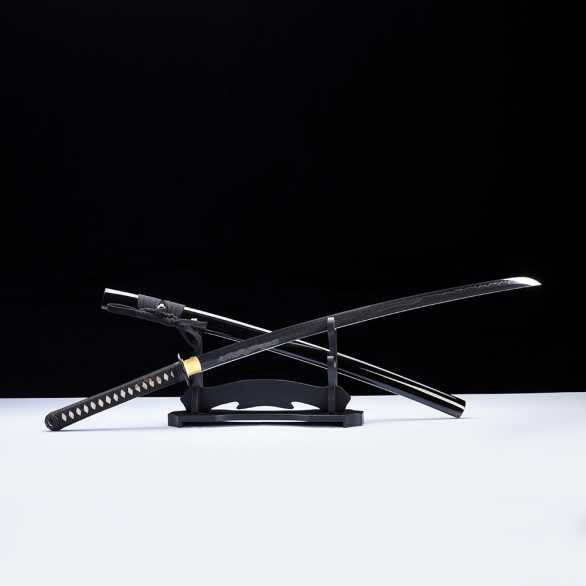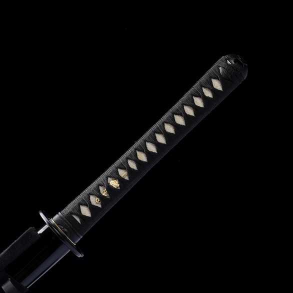 Differentially hardened fully sharpened T10 Tool Steel blade with real hamon and Dragon themed Horimono engraving. Solid bodied blade. Steel tsuba and Fuchigashira. Black rayon ito over authentic rayskin. Black Wooden lacquered saya.