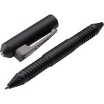 Tactical Pen Black. 5 1/8″ closed. Black aluminum construction with pocket clip. The pointed tip can be used for a defense tool or PDA stylus or pen. Remove cap to reveal writing pen with medium point black ink. The end of the cap features a metal tip that could be used as a glass-breaker or control device.